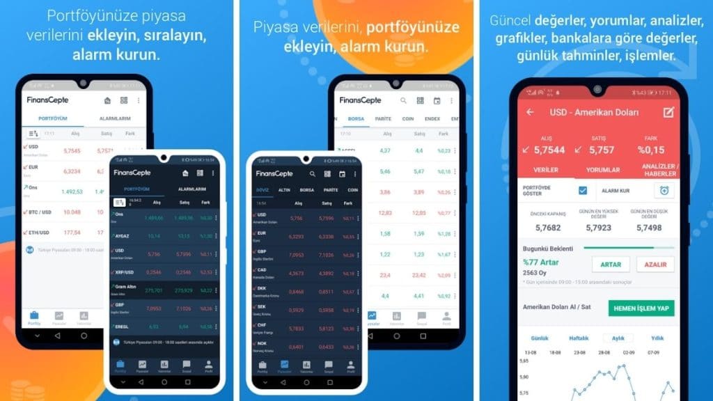 FinansCepte, genel olarak borsa takip uygulamalarının sunduğu pek çok aracı kullanıcılarına sağlıyor. Güncel döviz kurları, kripto para değerleri, BİST hisse sentleri vb. unsurları FinansCepte ile takip etmek mümkün. Ayrıca uygulamada yer alan döviz çevirici gibi araçlar ile yatırım işlemlerinizi hızlandırabilirsiniz.