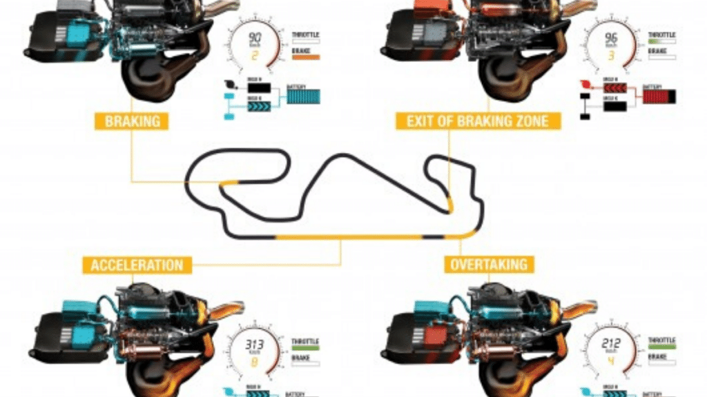 Araç virajlarda yavaşlamaya başladığında ise kinetik ünite bu sefer jeneratör olma görevini üstleniyor ve depoladığı enerjiyi ısıl üniteye aktarıyor. Böylece araçlar yavaşladığı zaman turbo türbinlerinin dönme hızı azalmıyor ve turbo gecikmesinin önüne geçiliyor. Aynı zamanda pilotlar tekrar gaza bastıkları zaman basınç ve itiş kaybı olmadığı için araçlar ivme kaybetmeden yarışa devam edebiliyorlar. Bu sırada turbo yüksek devirler çevirdiği için elektronik kontrol üniteleri de bu devirlerin altına inmesin diye turboyu kontrol ediyor. Pilotlar da yarış içinde ERS ünitesi ayarlarıyla pistin koşullarına ve uygulayacakları stratejilere göre direksiyon üzerinden değişikliker yapabiliyor. Bunu da standart elektonik kontrol ünitesi vasıtasıyla gerçekleştiriyorlar (SECU).
