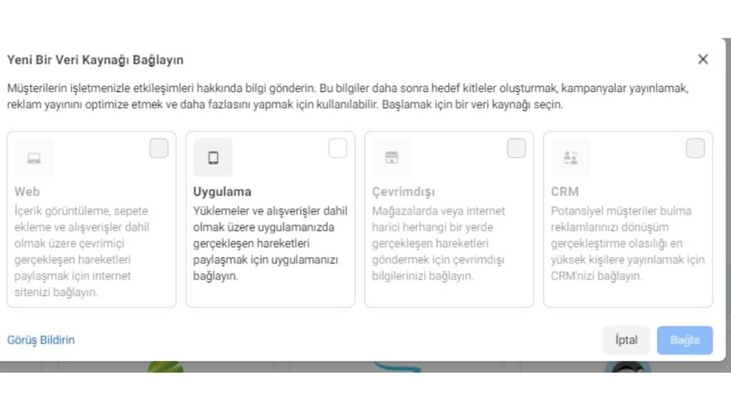 Facebook Olay Yöneticinize girdikten sonra Veri Kaynaklarını Bağlayın’a tıklayın. Karşınıza çıkacak dört kutucuk arasından Web/İnternet olanı seçin. Facebook Pixel’i seçin ve Bağla’ya tıklayarak devam edin. Pixel’inize bir isim verin ve kolay kurulum için web sitenizin adresini (URL) girerek devam edin.