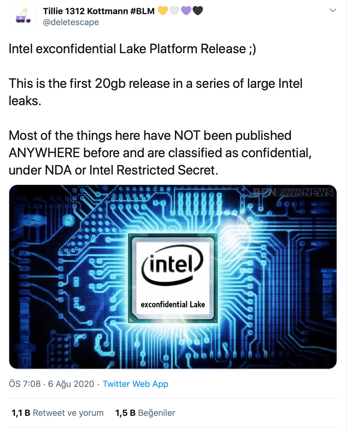 Intel, yonga setlerindeki halka açık olmayan bu teknik belgelerin yalnızca şirketin Kaynak ve Tasarım Merkezi’ne erişimi olan biri tarafından sızdırılabileceğini söyledi. Yonga üreticisi durumun takipçisi olduğunu belirterek “Bilgiler; müşterilerimiz, ortaklarımız ve erişim için kayıt yaptıran diğer harici taraflar tarafından kullanılmak üzere bilgilerin bulunduğu Intel Kaynak ve Tasarım Merkezi’nden geliyor. Erişimi olan bir kişinin bu verileri indirip paylaştığını düşünüyoruz.” dedi.