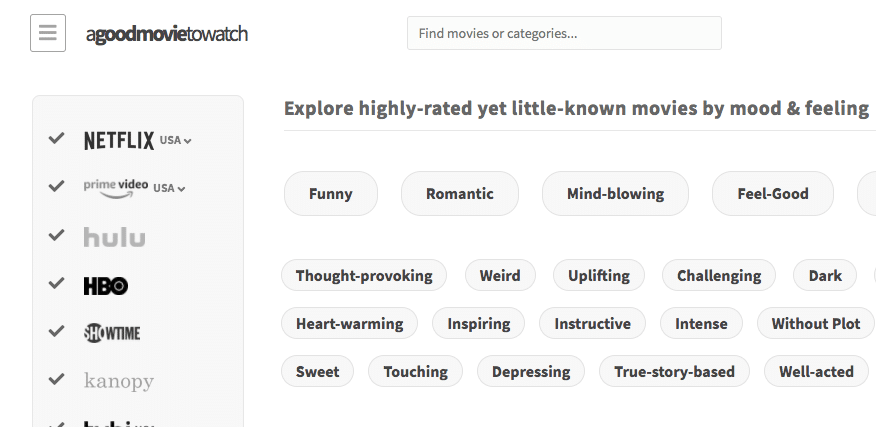 İnternet ortamı film izlemek için oldukça popüler bir araçtır. Bazı akşamlar, sadece iyi bir film izlemek istiyorsanız “A Good Movie to Watch” devreye giriyor. Site küçük bir yazar ve editör ekibi tarafından yönetiliyor. Yüksek puanlı ancak az bilinen filmler önermek için algoritmalardan ziyade insan seçimlerine güveniyor. Şu anda Amazon Prime Video ve Netflix‘te yayınlanıyor. Sitede öneri kategorisi mevcut ve aynı zamanda modunuza göre farklı filmler karşınıza çıkıyor. Böylece film seçmek veya en azından kategori seçmek daha kısa zaman alıyor.