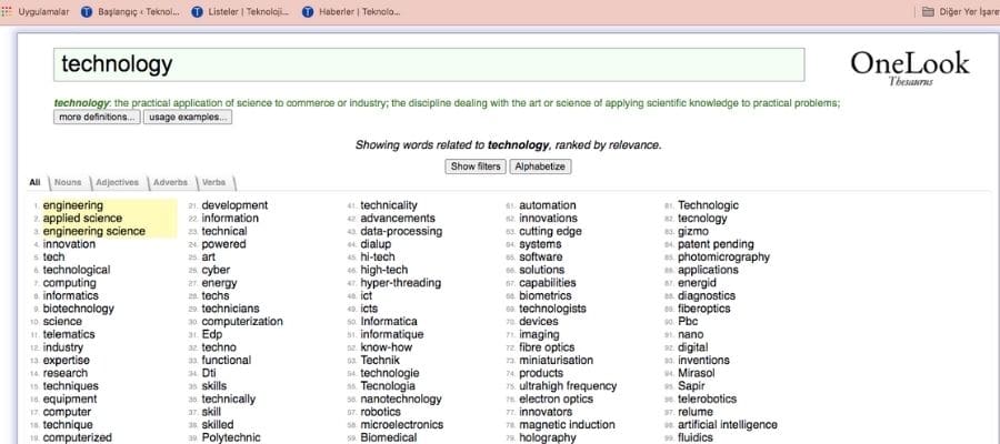 OneLook Dictionary, herhangi bir yazı yazan veya herhangi bir iletişimde bulunan herkes için gerçekten paha biçilmez bir araçtır. Anlamını biliyorsanız ama kelimenin kendisi hatırlamıyorsanız bu site sizler için faydalı olacaktır. OneLook Dictionary, kelimeyi açıklayan birkaç kelime girebildiğiniz sürece, dilinizin ucundaki kelimeyi size söyleyecektir.