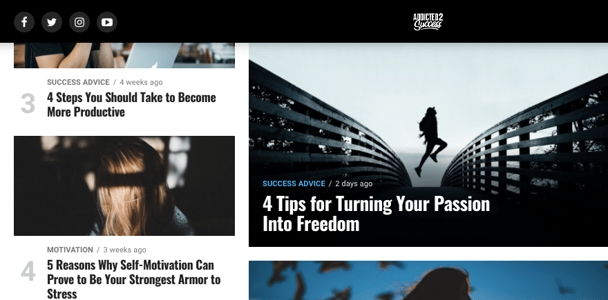 Addicted2Succes isimli site, ünlü girişimcilerin kariyerlerine hangi zorlukları atlatarak başladıklarını anlatan makaleler içeriyor. Sitede hayatlarını tersine çevirmek isteyen insanlara ilham vermek ve onları güçlendirmek için tasarlanmış makaleler bulunuyor. Girişimcilik, kendini geliştirme ve başarıya atılan yolların yapılması için amaçlanmış başarı hikayeleri mevcut.