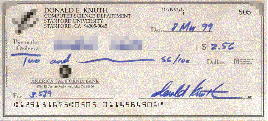 Knuth’un kitabında yer alan yanlışları tespit etmek için ilginç bir metodu vardır. Daha doğrusu bu yanlışları kendisinin değil okuyucularının bulmasını teşvik eder. Her bulunan yanlış için 2.56 dolarlık bir ödül gönderir. Bu ücret on altılı sayı sistemine bir atıftır. Ancak, bu yöntemle dolandırıcılığa kurban olmamak için artık çek gönderememektedir. Bunun yerine kurgusal bir banka oluşturmuş ve ödül sahiplerinin sertifikalarını bankada biriktirmeye başlamıştır.