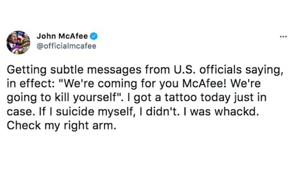 Enteresandır ki, 2019 yılında John McAfee Twitter üzerinden ilginç bir paylaşımda bulunuyor. Bu paylaşımında ABD’li yetkililer tarafından tehditler aldığını ve asla intihar etmeyeceğini bildirmişti. Aynı zamanda 2020 yılında “kendimi asarsam bu benim suçum olmayacak” ibaresi geçen bir tweet daha atmıştı. Enteresan olan bir diğer şey ise onun bu ay gerçekleştirilen video-konferanslı duruşmasında kendisine yapılan suçlamaların tümünün politik olduğunu iddia etmiş olması.