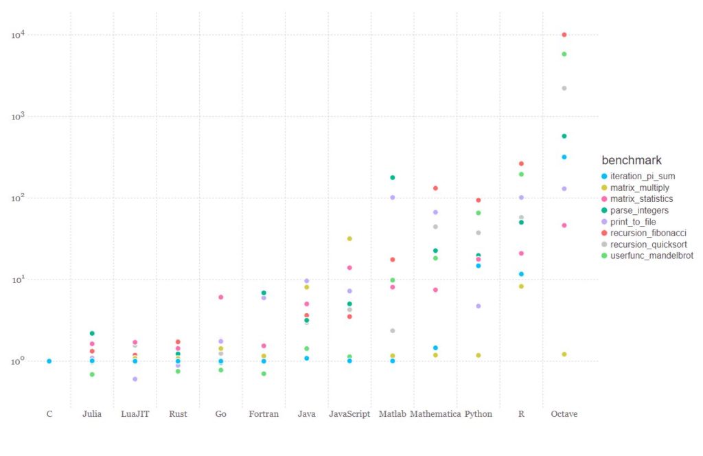 Julia’nın bütün bu gereksinimleri karşıladığı söylemlerini desteklemek için benchmark (kıyaslama yapan bir bilgisayar programı) sonuçlarından bir örnek göstermek faydalı olacaktır: