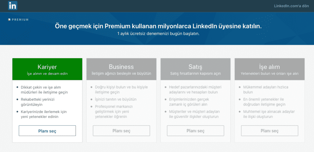 Linkedin Premium her planı farklı kullanıcı tipine hitap eden dört plandan oluşuyor. Hangi plan hangi kullanıcıyı hedefliyor aşağıda göz atalım: