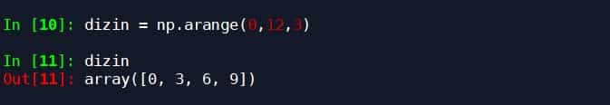 np.arange() fonksiyonu 4 parametre alır. Bunlar başlangıç değeri, bitiş değeri, değişim miktarı ve veri tipidir. Fonksiyon başlangıç noktasından bitiş noktasına kadar değişim miktarı kadar artarak girilen veri tipinde değerler üretir. Yukarıdaki örnekte başlangıç 0, son ise 12’ydi. Değişim miktarımızda 3 olduğundan np.arange() fonksiyonu 0’dan üçer üçer artarak bize bir dizin üretti.