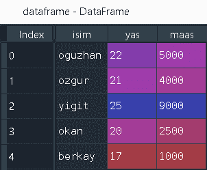 print(dataframe[dataframe['maas']>4000]) #Çıktı : isim yas maas 0 oguzhan 22 5000 2 yigit 25 9000
