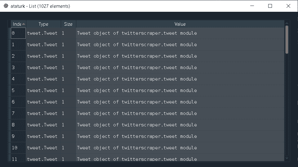 TwitterScraper için parametre değerlerimizi tanımlayabiliriz. Ben bu Python uygulamasında “Atatürk” ile atılmış tweetleri çekmek istiyorum ve DateTime kütüphanesini kullanarak başlangıç ve bitiş günlerimi belirliyorum.